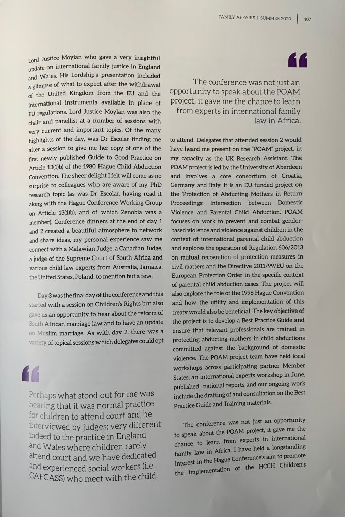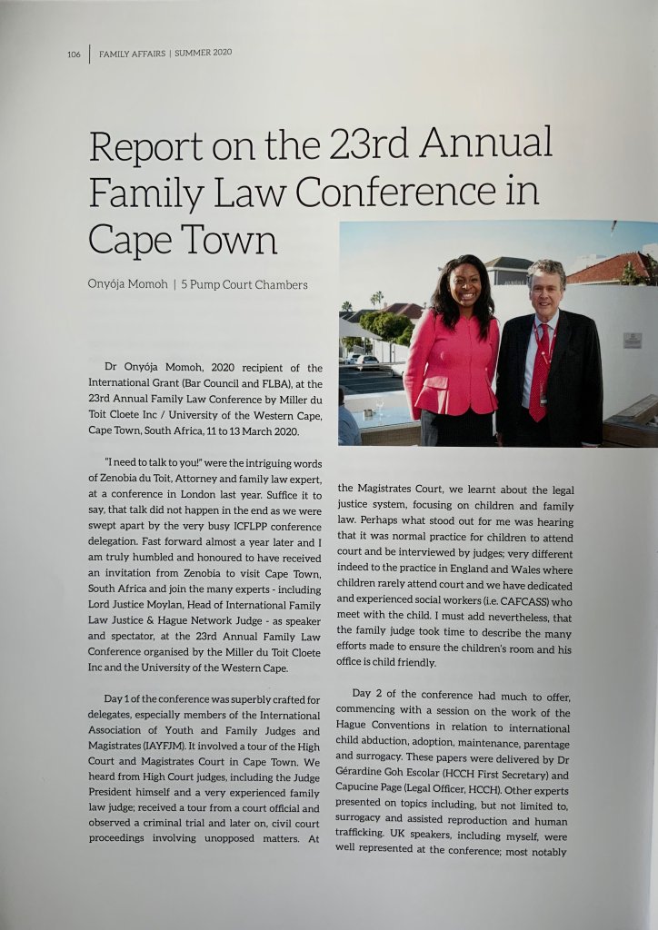 Dr Onyoja Momoh, 2020 recipient of the International Grant (Bar Council and FLBA) attended the 23rd Annual Family Law Conference by Miller du Toit Cloete Inc / University of the western Cape, Cape Town South Africa, as a speaker and spectator. The trip was also part-funded by the University of Aberdeen, Centre for Private International Law, under the auspices of the POAM project.